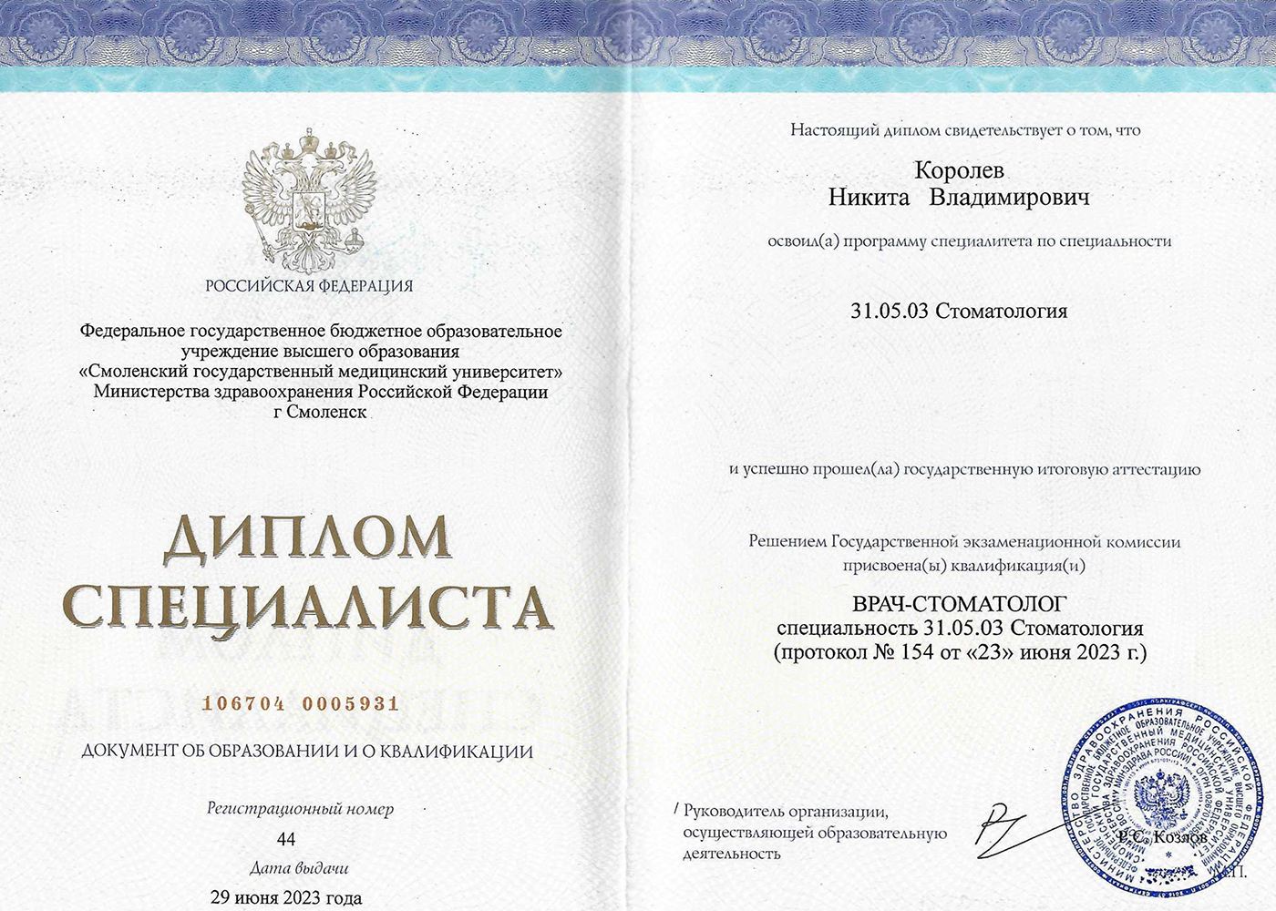 2023 г. – Федеральное государственное бюджетное образовательное учреждение высшего образования «Смоленский государственный медицинский университет» Минздрав РФ г. Смоленск. Высшее – специалитет. Врач-стоматолог по специальности «Стоматология». Дата выдачи 29.06.2023г.
