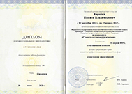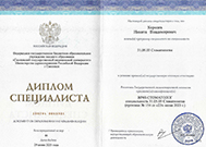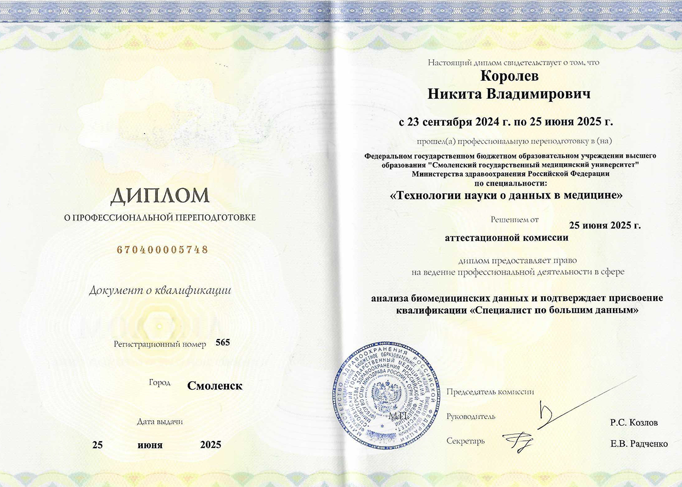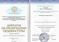 2025 г. – Федеральное государственное бюджетное образовательное учреждение высшего образования «Смоленский государственный медицинский университет» Минздрав РФ г. Смоленск. Ординатура по специальности «Стоматолог общей практики» от 24.06.2025, протокол №206.