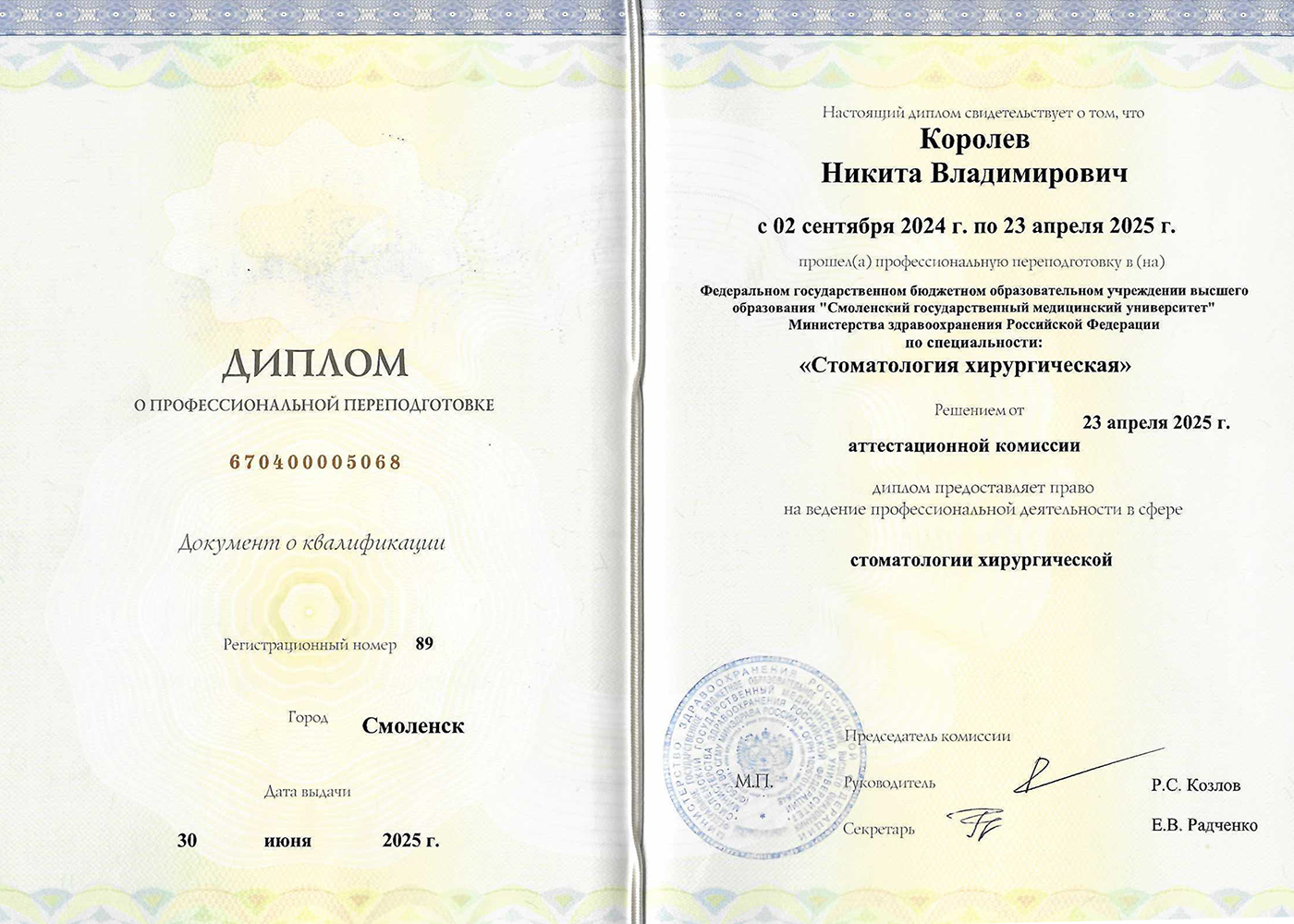 2025 г. – Федеральное государственное бюджетное образовательное учреждение высшего образования «Смоленский государственный медицинский университет» Минздрав РФ г. Смоленск. Профессиональная переподготовка по специализации «стоматология хирургическая» от 23.04.2025г.