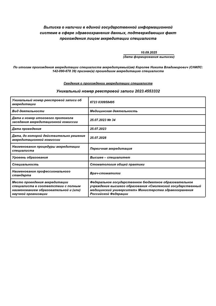 2025 г. – Федеральное государственное бюджетное образовательное учреждение высшего образования «Смоленский государственный медицинский университет» Минздрав РФ г. Смоленск. Первичная аккредитация по специальности «Стоматология общей практики». Действительна до 25.07.2028 г. Уникальный номер реестровой записи об аккредитации 6723030958495.